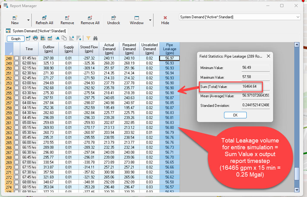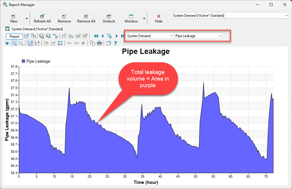 It is universally understood that “the area under the curve” approximates the total volume of water for each of the “System Demand” output graphs in InfoWater Pro. Although a “Totalizer” can be applied to a pipe, it is not currently possible to query the “System Demand” output for totalized volume. While a totalized volume can be approximated by hand using the System Demand Report, this would be unnecessary (and likely more accurate) if there were an option to have IWP tabulate Cumulative Volume for each time step (similar in function to a pipe totalizer), especially for Pipe Leakage.