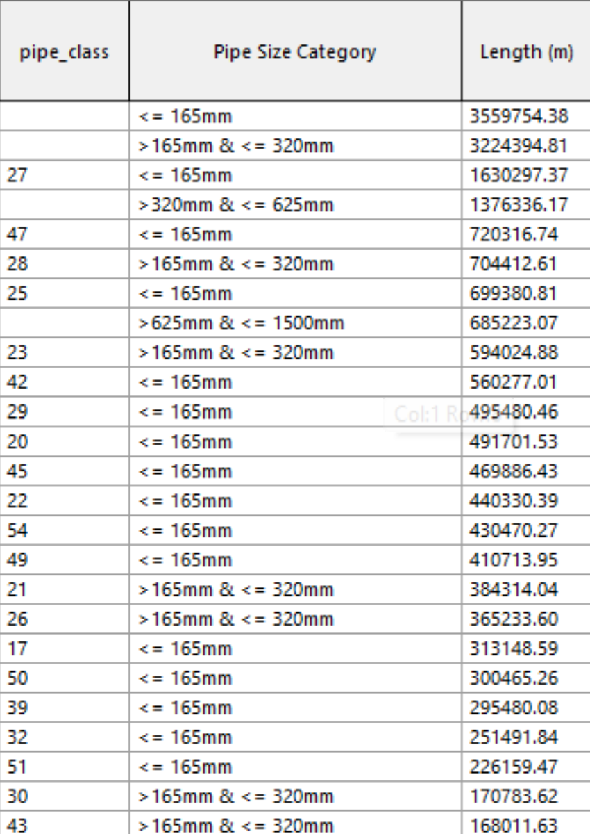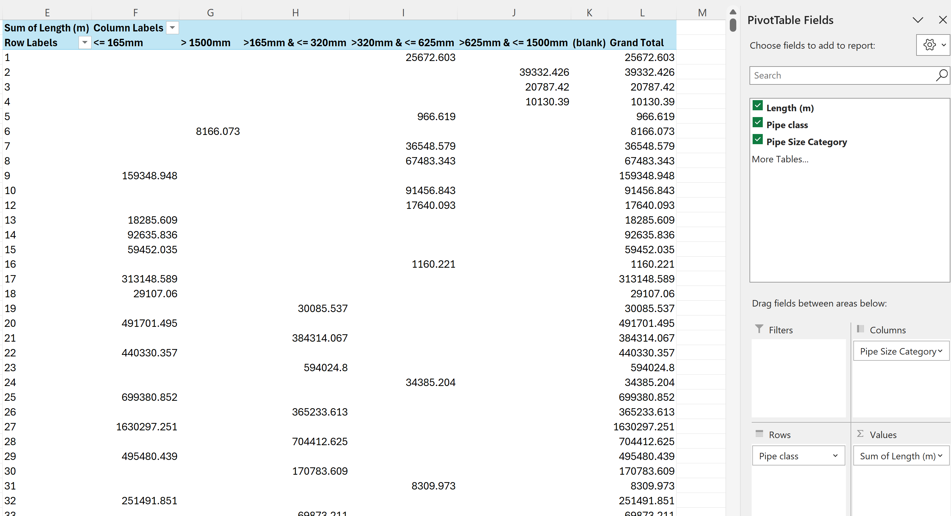 This will produce a long list of grouped combinations of each pipe class and Pipe Size Category. This long list is not as easy to read or interpret compared to how Excel is able to create a matrix comprising 2 axis, with grouped Pipe Class on one axis and Pipe Size Category on the other.